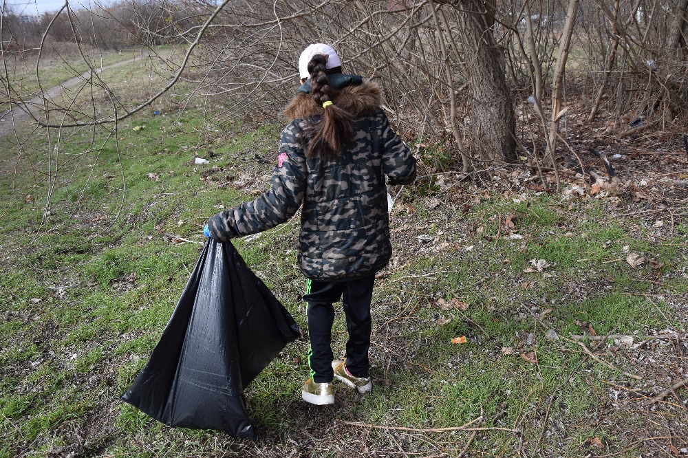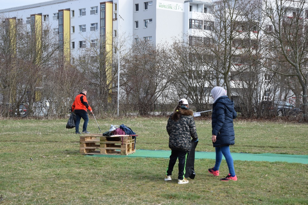 Das war auch dringend nötig. Über den Winter hatte sich eine Menge Unrat angesammelt, obwohl es inzwischen auf dem Areal einen BSR-Abfalleimer gibt. Achtzehn Freiwillige aus der Nachbarschaft und der angrenzenden Gemeinschaftsunterkunft, darunter auch einige Kinder, griffen sich Handschuhe, Greifzangen und Müllbeutel und schwärmten zwischen Bäumen und Sträuchern aus. Nach einer Stunde sah das Gelände wieder sauber aus. Adam Page von der station urbaner kulturen ging zum Schluss noch mal mit einer Schaufel los, um „Tretminen“ zu beseitigen, damit Kinder auf der Grünfläche unbesorgt spielen können. Eine Bitte an die Hundebesitzer an dieser Stelle, die Hinterlassenschaften ihrer Lieblinge zu beseitigen.