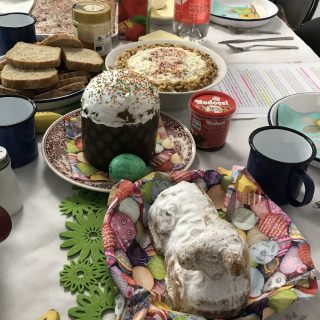 Die station urbaner kulturen hatte sich am 28. April österlich geschmückt. Auf zwei Tischen gab es neben selbst gebackenem Brot und Kuchen auch gefüllte Pasteten und typisch russische Osterspezialitäten.