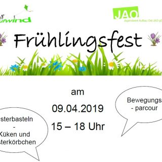 Der Lenz lässt nun nicht mehr lange auf sich warten. Die Sonne scheint öfter und an den Bäumen sprießen die Blätter. Mit einem Fest am 9. April von 15-18 Uhr will das Kinder-, Jugend- und Familienzentrum Haus “AUFWIND” den Frühling begrüßen. Es gibt einen Bewegungsparcours und eine Hüpfburg und natürlich können Osterküken und -körbchen gebastelt werden. Für den Kuchenbasar werden Kuchenspenden gewünscht.