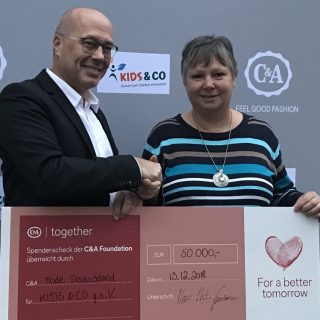 C&A Deutschland und die C&A Foundation überreichten am 13. Dezember 2018 einen Scheck über 50.000 Euro an den Verein KIDS & CO. Mit dem Geld können drei Stellen in Projekten weiter gefördert werden.