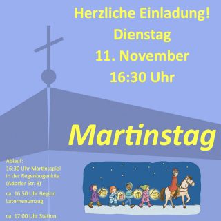 Die Evangelische Kirchengemeinde Berlin-Hellersdorf lädt in Kooperation mit dem Deutsch-Polnischen Hilfswerk am 11. November zum diesjährigen Martinstag ein. Beginn ist um 16.30 Uhr mit einem Martinsspiel im Garten der Regenbogenkita (Adorfer Straße 8). Anschließend führt Martin hoch zu Ross den Laternenumzug durch das Viertel.