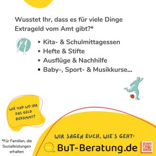 Wer Bürgergeld, Sozialhilfe, Wohngeld, Kinderzuschlag oder Leistungen nach dem Asylbewerbergesetz bezieht, kann sich kostenlos beraten lassen, welche Leistungen das Bildungs- und Teilhabepaket BuT bietet. Auch beim Beantragen gibt es mehrsprachige Hilfe.