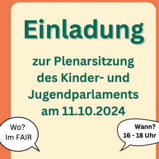 Am 11. Oktober 2024 findet von 16 bis 18 Uhr die Plenarsitzung des Kinder- und Jugendparlaments Marzahn-Hellersdorf im Saal der Jugendfreizeiteinrichtung FAIR, Marzahner Promenade 51, statt.