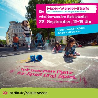 Am 22. September 2024 wird die Maxie-Wander-Straße zwischen Klingenthaler Straße und Carola-Neher-Straße von 15 bis 19 Uhr zu einer temporären Spielstraße mit Spiel- und Bewegungsangeboten. Mit dabei ist die Künstlerin Carola Rümper vom „mp43″. Sie lädt die Nachbarschaft zum Mitspielen mit dem XXL-Memory ein, das an diesem Tag an die Nachbarschaft übergeben wird. Es entstand im Rahmen des Kunstprojektes „playground – es wird weitergespielt“ (Programm Sozialer Zusammenhalt). Im Fokus des Projekts standen nationale und internationale Spiele.