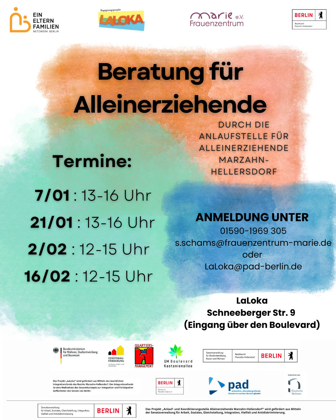 Alleinerziehende können sich am 10. Dezember 2025 von 13-16 Uhr im „LaLoka“ (Schneeberger Straße 9) beraten lassen. Anmeldungen sind telefonisch unter 01590-1969305 oder per E-Mail möglich. Neue Termine für 2026 siehe Plakat.