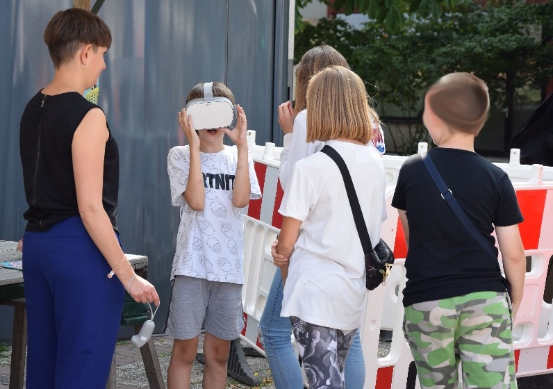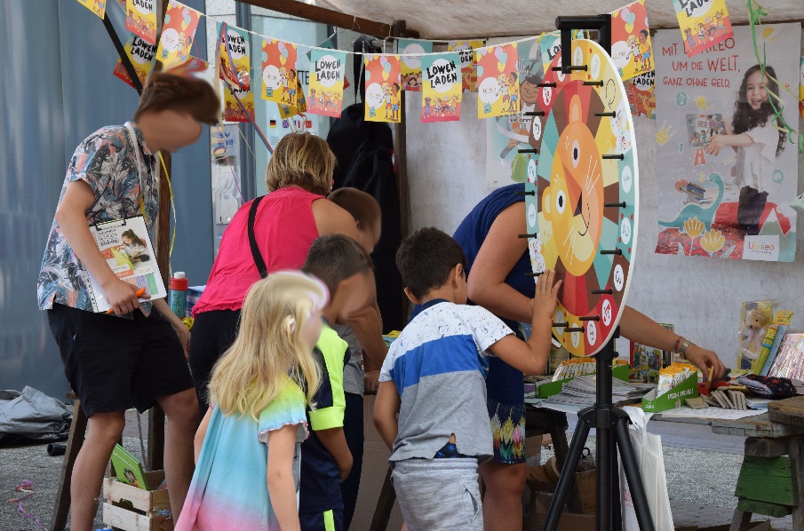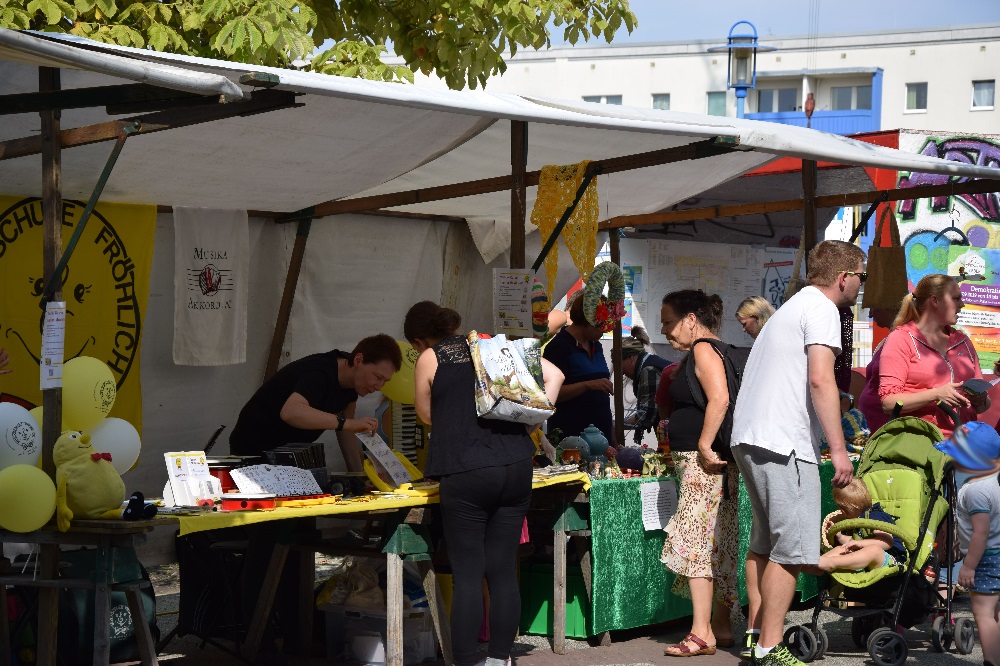 Von Stunde zu Stunde wurde es dann voller auf dem „Mittelpunkt“ am Boulevard Kastanienallee. Bis zum Abend kamen rund 300 Besucher*innen zu den Ständen, stöberten durch das Infomaterial, fragten nach und probierten aus. Beim „Löwenladen“ konnten Kinder und ihre Eltern schmökern, am Stand des Naturschutzzentrums Schleipfuhl war Geschicklichkeit beim Hölzchenlabyrinth gefragt und beim Projekt „Fit für die Zukunft“, ebenfalls finanziert aus Mitteln der Sozialen Stadt, standen die Kids Schlange, um mal durch eine VR-Brille zu schauen. An einigen Ständen – wie z.B. dem der Gemeinschaftsunterkunft – konnte gemalt und gebastelt werden. Der Verein „Mittendrin e. V.” bot Selbstgefertigtes und noch Guterhaltenes zum Kauf an. Großen Spaß hatten selbst die kleinsten Kinder an den Spiel- und Sportangeboten. Beim Stand des BENN – und Quartiersmanagements gingen die Magnete weg wie warme Semmeln, ebenso die Trinkbecher. Etwas geruhsamer ging’s beim Café auf Rädern zu, Besucher*innen nutzten die Gelegenheit für einen kleinen Plausch.