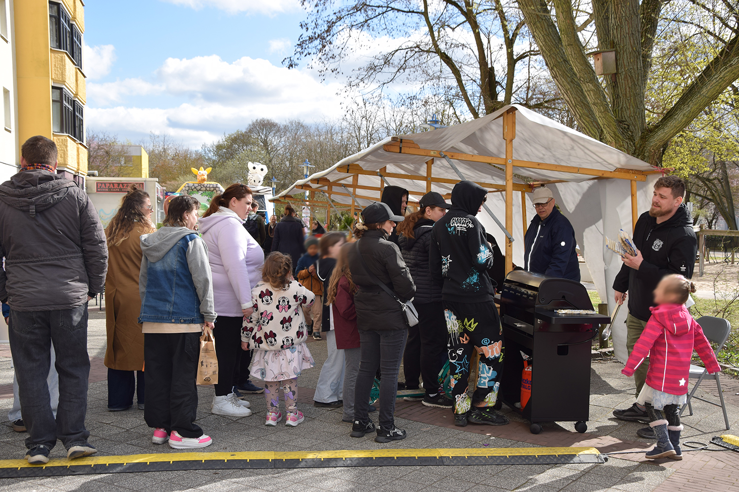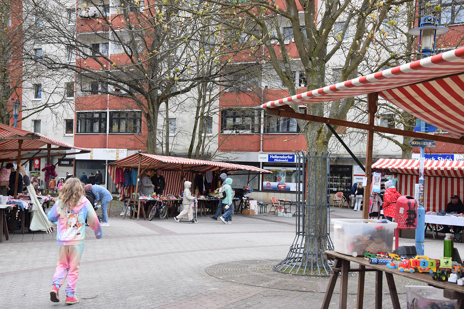 Lange Schlangen wie immer vor dem Grill, auf dem leckere Bratwurst brutzelte. Nebenan ein reich gedecktes Kuchenbuffet, die „Standmieten“ vom Trödelmarkt. Der hatte am zentralen Platz zahlreiche Stände aufgebaut, an dem man Bekleidung, Spielzeug, Bücher, Haushaltswaren, Schmuck und vieles mehr erstehen konnte. Und die Käufer:innen ließen auch nicht lange auf sich warten.