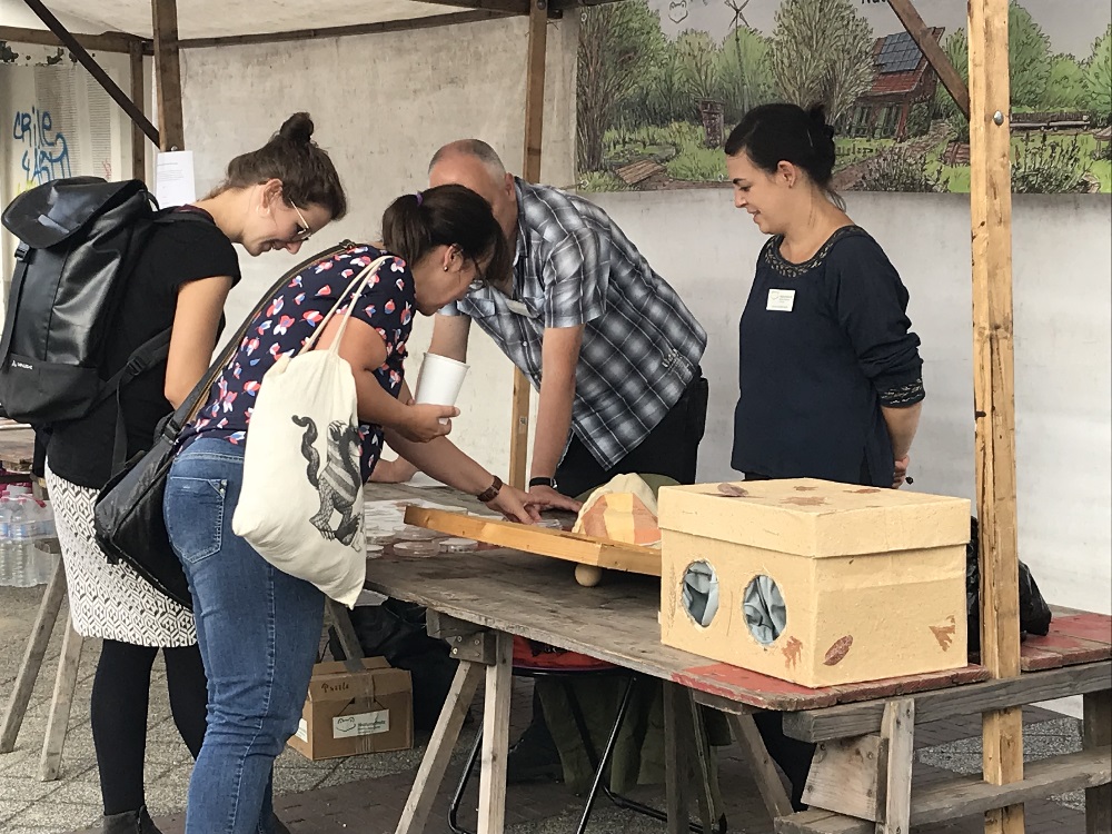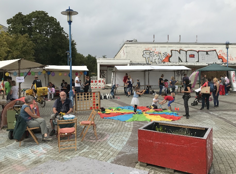 Pünktlich zum Start um 14 Uhr wagte sich die Sonne hervor und lockte zahlreiche Kinder und ihre Eltern zum Mittelpunkt des Quartiers Boulevard Kastanienallee. Vor der alten Kaufhalle hatten Vereine, Projekte und Einrichtungen Infostände aufgebaut, präsentierten ihre Angebote und forderten zum Mitmachen auf. Bei der Naturschutzstation Schleipfuhl war Fingerspitzengefühl gefragt, als es um verschiedene Naturmaterialien ging.