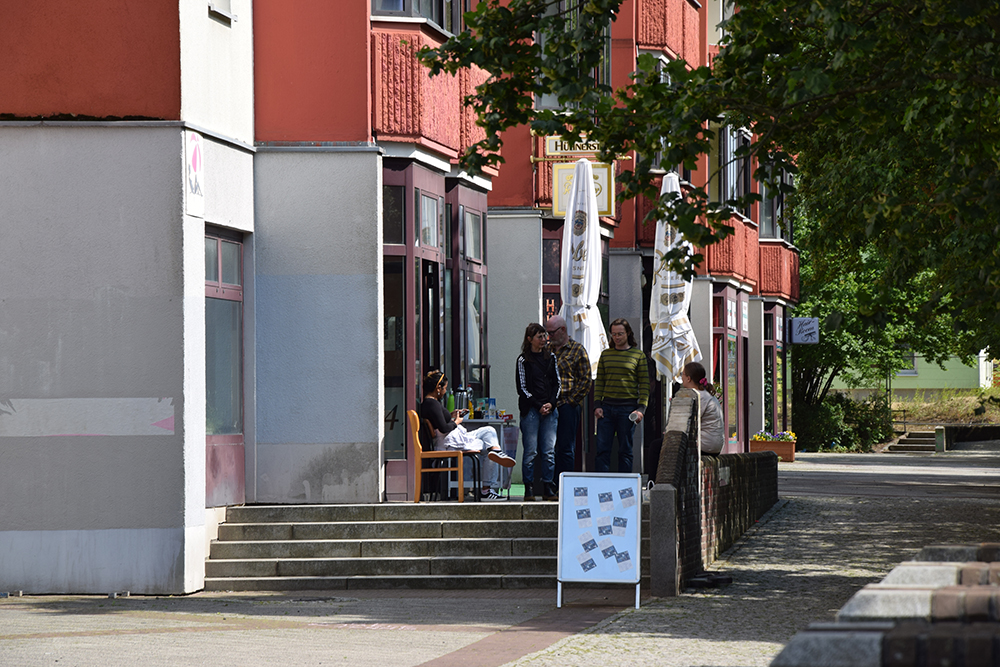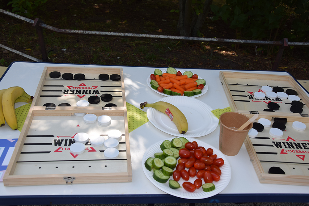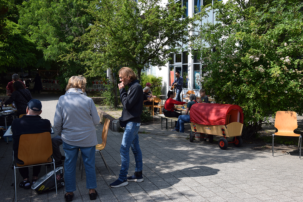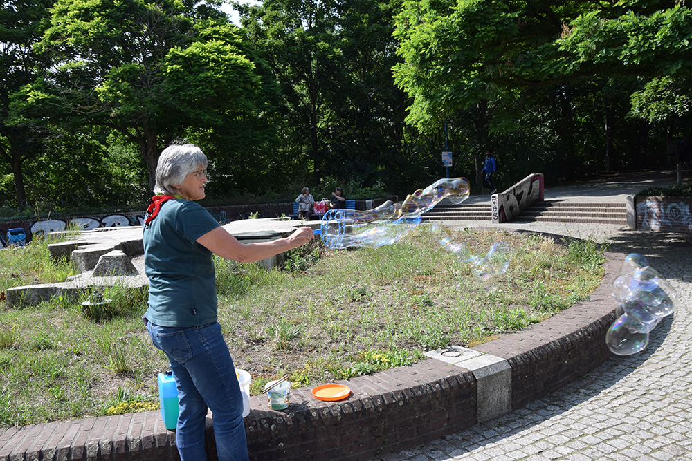 Vor dem Puppentheater schwelgten die Erwachsenen bei Springseil-Hopsen und “Himmel und Hölle” in Kindheitserinnerungen, am Tisch der evangelischen Kita konnte man Wurfbecher basteln, vor dem Stadtteilbüro des Quartiersmanagements Boulevard Kastanienallee gab es Tischtennis-Sets zum Ausleihen und beim Schülerzentrum „Kraftwerk“ Süßes und Spiele, bei den Mitarbeitenden vom „U5“ wurde Fußballdarts gespielt und die evangelische Kirchengemeinde bot Halma und Mensch-ärgere-dich-nicht in XXL-Format an. Vor dem „LaLoka“ war ein Katapultspiel aufgebaut und das Spielmobil von „Roter Baum“ e. V. machte auf dem Zentralen Platz Station, gleich neben der Hüpfburg. Es gab zudem eine Schatzsuche als Schnitzeljagd, wo Preise gewonnen werden konnten, denn auch der Wettstreit gehört zum Spielen dazu. Am ehemaligen Landschaftsbrunnen sorgte das Deutsch-Polnische Hilfswerk für leckeres Essen und Trinken, mit musikalischer Untermalung vom Haus „Erntekranz“. Im „mp43 -projektraum für das periphere“ lief die Finissage der Ausstellung „Loser-Ehre“, die sich mit dem Thema Spiel und Spielen auseinandersetzte. Dort konnte man sich beim Tischtennisspielen ausprobieren. Als Netz diente eine Blumenhecke.