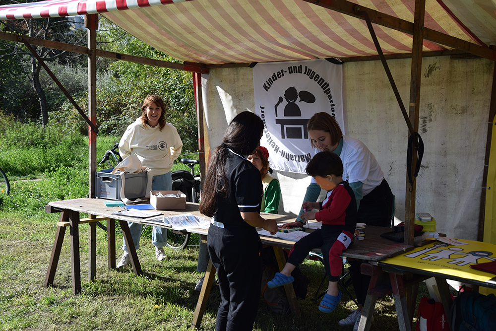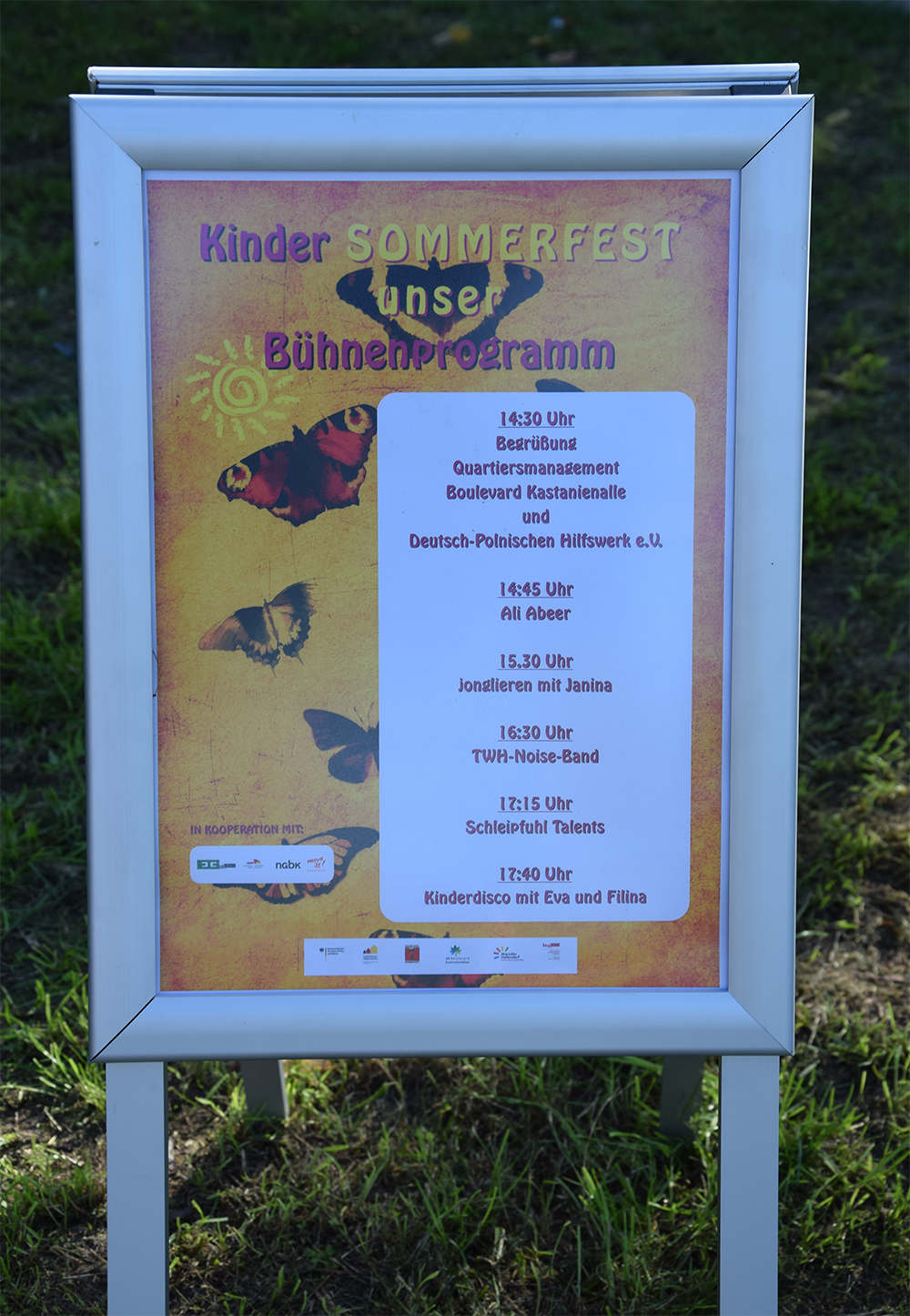 Verschiedene Einrichtungen und Projekte aus dem Kiez und dem Bezirk stellten sich mit ihren Angeboten vor, wie beispielsweise das Begegnungszentrum „LaLoka“, das Parkmanagement, das Projekt „Die Müllpiraten“ und auch das Quartiersmanagement. Das in Gründung befindliche Kinder- und Jugendparlament Marzahn-Hellersdorf sammelte Wünsche von Kindern, für deren Umsetzung es sich einsetzen will. Die Polizei war mit einem Einsatzwagen und einem Infostand dabei, an dem man seine Kenntnisse der Verkehrsregeln und das Verhalten im Gefahrenfall testen konnte. Bei Carola Rümper vom „mp43“ gab’s das neue Kiez-Skatspiel und Kinder konnten sich kreativ betätigen, ebenso wie nebenan beim Verein „Deutsch-Polnisches Hilfswerk“, den Organisatoren des Festes, und beim Wandergarten. Um Geschicklichkeit ging es bei „Move it!“ und bei Opa Manne (einem ehrenamtlich aktiven Bewohner), wo die Kinder Schlange standen. Die gab es natürlich wie immer auch beim Schminken. Auf und vor der Bühne wechselten sich internationale Musik und Mit-Mach-Angebote ab. Für das leibliche Wohl sorgte ein ständig umlagerter Bratwurststand und die leckeren Kuchen von der Gemeinschaftsunterkunft Maxie-Wander-Straße.