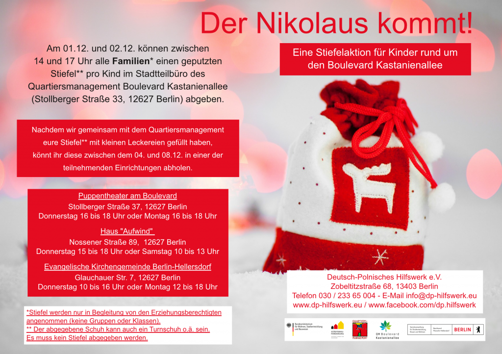 Am 1. und 2. Dezember 2025 können Familien zwischen 14 und 17 Uhr einen geputzten Stiefel pro Kind im Stadtteilbüro des QMs Boulevard Kastanienallee (Stollberger Straße 33) abgeben. Diese werden durch das Deutsch-Polnische Hilfswerk gefüllt und können dann am 4. und 8. Dezember in den unten angegebenen teilnehmenden Einrichtungen abgeholt werden. Das QM-Büro ist keine Abholstation, sondern dient nur der Abgabe. Noch ein Hinweis: Die Stiefel/Turnschuhe werden nur in Begleitung von Erziehungsberechtigten angenommen, es sind keine Gruppen oder Klassen erlaubt.