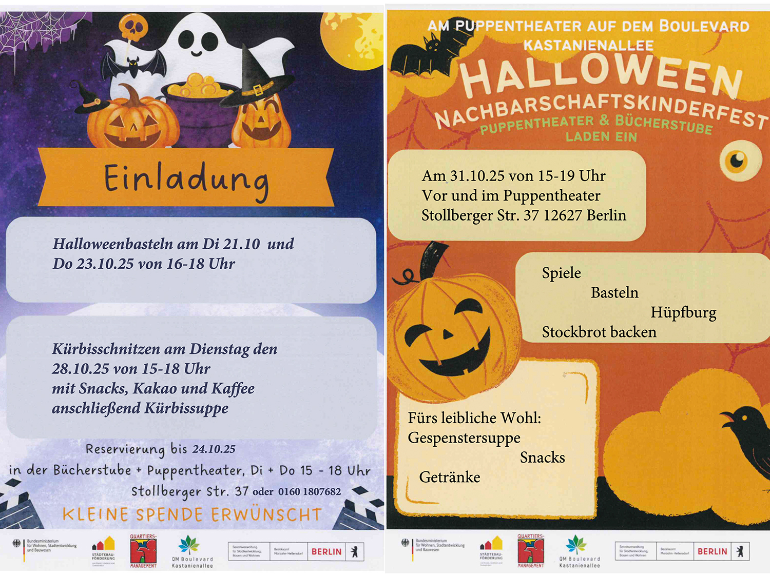 Das Halloweenfest wird im Rahmen des Projektes „Nachbarschaftstreff Puppentheater“ aus dem Programm „Sozialer Zusammenhalt” gefördert.