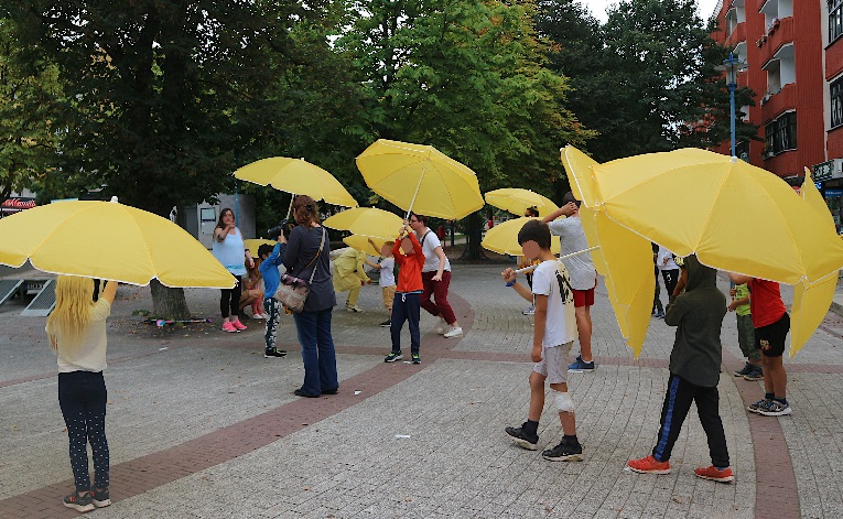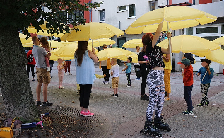 Dabei wurde auf dem zentralen Platz mit gelben Schirmen das Wort „HAPPY“ dargestellt. Zuerst ging es darum, die Schirme aufzuspannen und festzuhalten. Da mussten sich die Jüngsten schon mächtig anstrengen, was ihnen aber ganz offensichtlich großen Spaß machte. Dann musste das Gewusel sich zu dem Wort HAPPY formen. Aber auch das wurde geschafft. Das Beweisfoto machte dann eine Drohne, gekonnt gesteuert von Rosa Vill. Die anderen Bilder hat wieder die elfjährige Nachwuchsfotografin Helin gemacht, die das Projekt seit einiger Zeit begleitet.