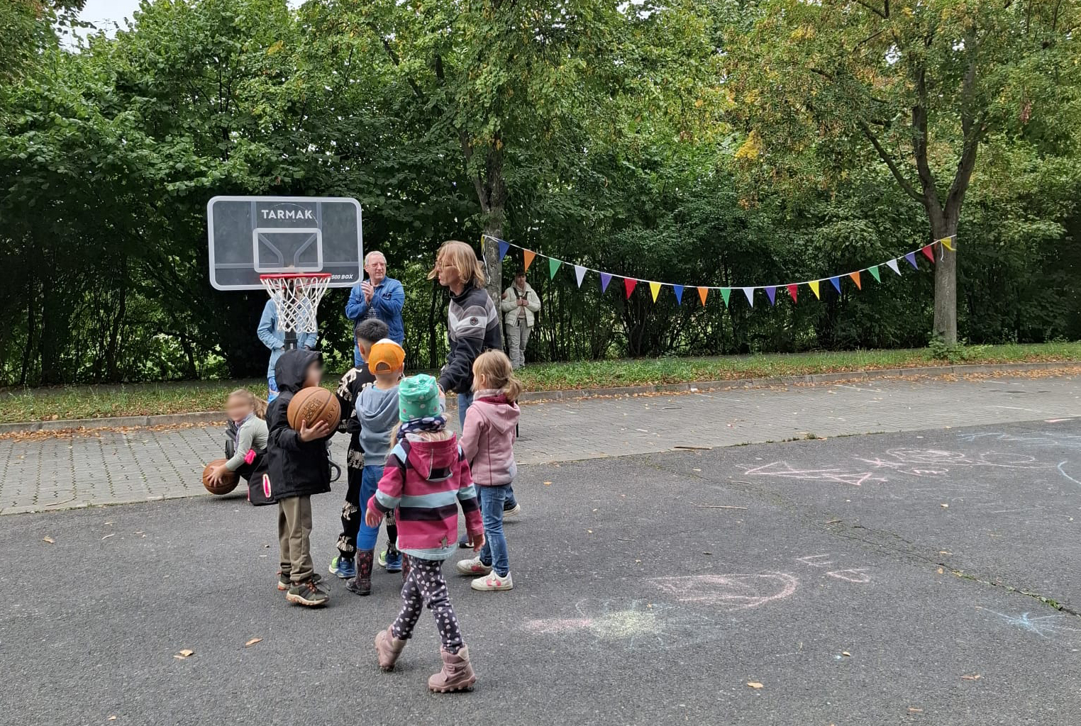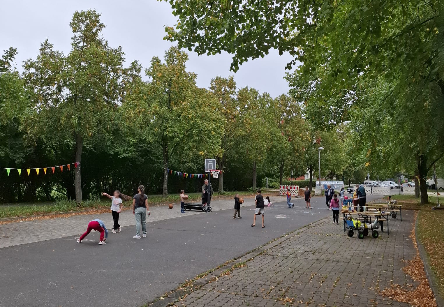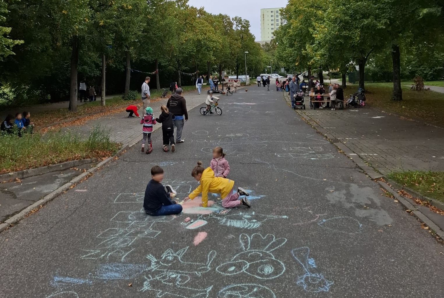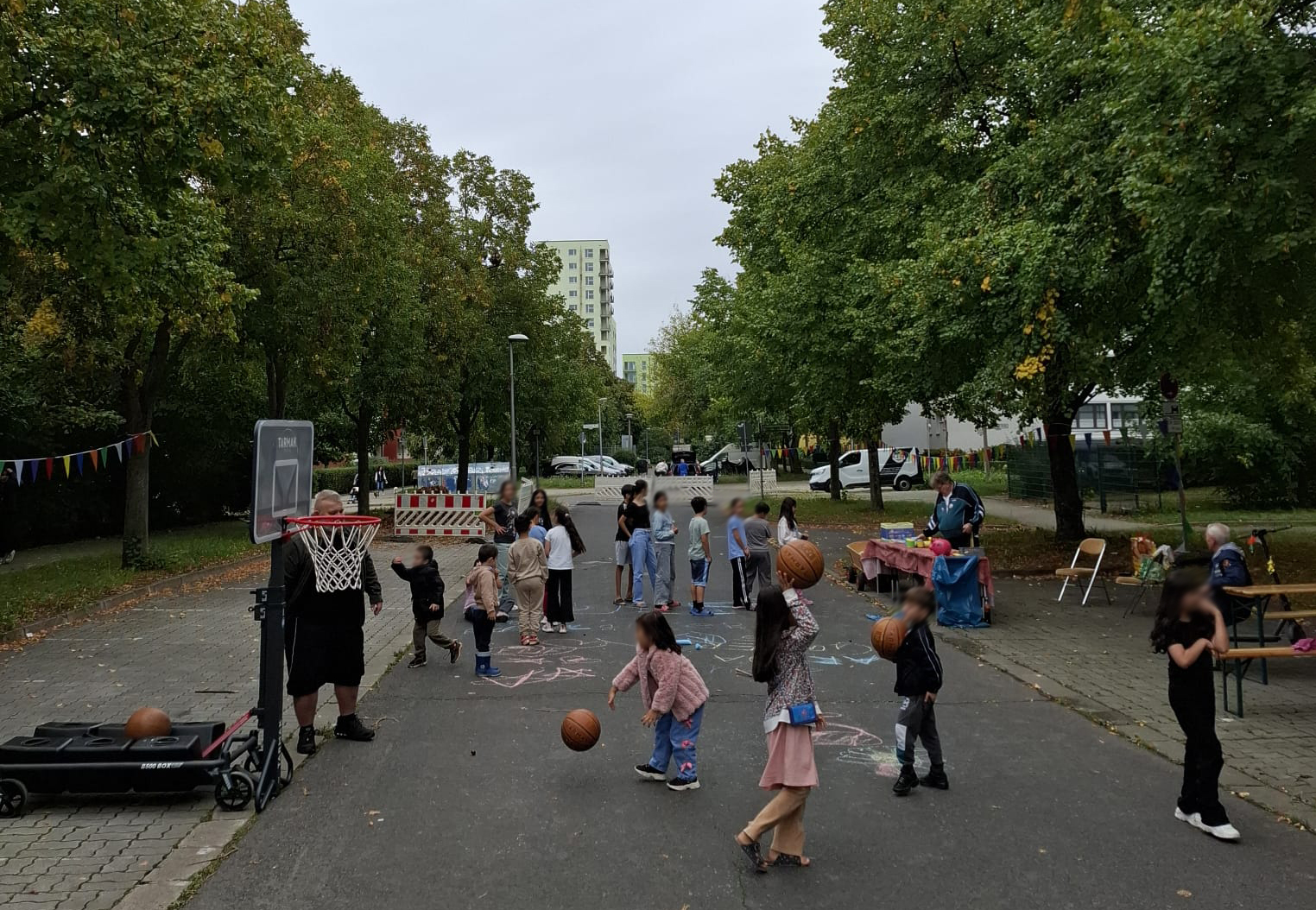 Die teilweise gesperrte Maxie-Wander-Straße wurde am 22. September 2025 für vier Stunden wieder zur Temporären Spielstraße. Die Kinder waren begeistert – mit dem Roller mal so richtig auf der Straße fahren! Aber auch andere Angebote wie Büchsenwerfen, Fußball- und Basketballspielen oder Malen auf dem Asphalt wurden gerne angenommen, ebenso die diversen Bewegungsspiele.