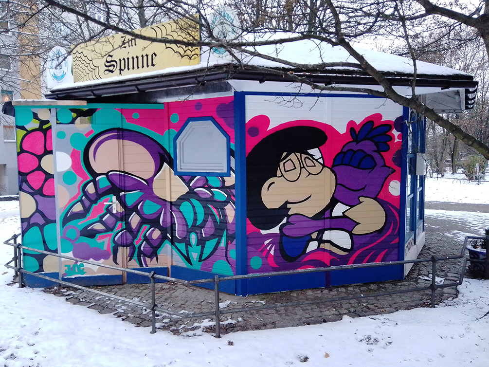 Soweit es sein Job und das Wetter zulassen, will er bald wieder mit der Sprühdose in der Hand auf dem Boulevard stehen. Und gerne würde er auch wieder etwas gemeinsam mit dem Puppentheater machen, so wie bei Halloween. „Es gibt schon einige Ideen, zum Beispiel Workshops mit Kindern, aber die müssen noch weiter entwickelt werden.“