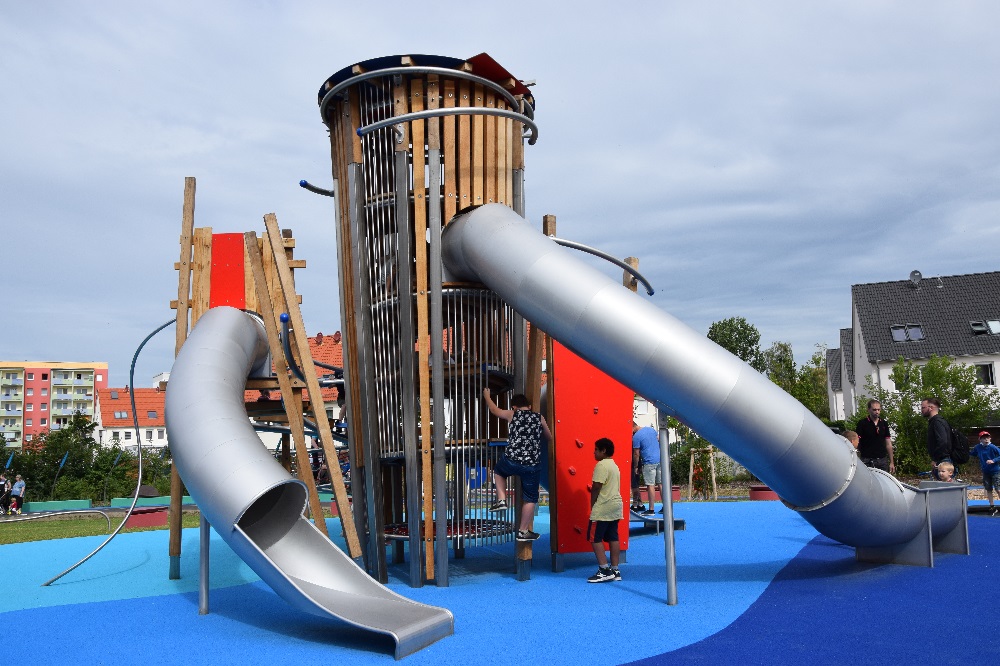 Am 13. Juli 2022 war es endlich so weit: Nach dreieinhalb Jahren Planungs- und Bauzeit wurde der neue Spiel- und Erholungsort „Im Aufwind …“ zwischen Klingenthaler Straße und Carola-Neher-Straße in Anwesenheit von Juliane Witt, Bezirksstadträtin für Stadtentwicklung, Umwelt- und Naturschutz, Straßen- und Grünflächen, eröffnet.
