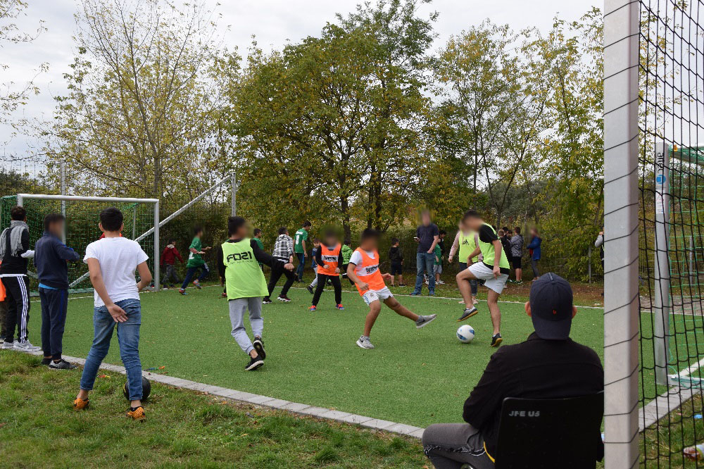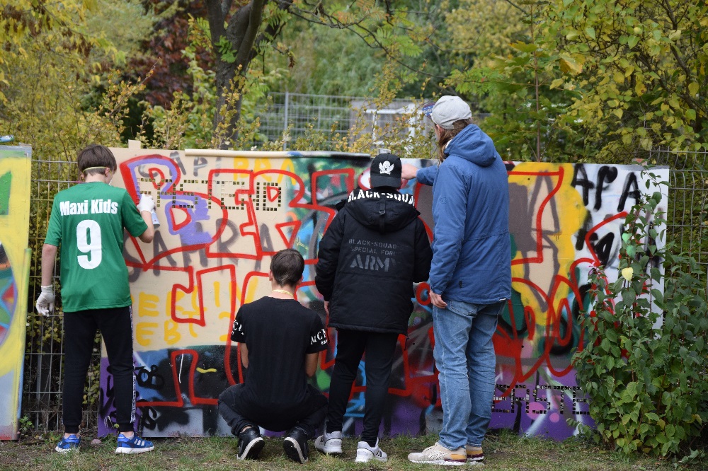 Das wurde natürlich sofort mit einem kleinen Fußballturnier eingeweiht. Da spielten „Die Coolen“ gegen die „Käniks“ und das Team vom „U5“ gegen das „Maxie“-Team, angefeuert von den interessierten Zuschauer*innen. Einige versuchten sich aber auch an der Graffiti-Wand, andere kickerten oder ließen sich das leckere Buffet schmecken.