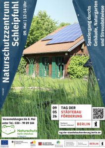 Das Programm startet um 12 Uhr im Naturschutzzentrum Schleipfuhl (Hermsdorfer Straße 11 A). Ein Rundgang führt dort durch das Gebäude und über die Streuobstwiese. Die Leitung erläutert die bauliche Modernisierung und den ökologischen Nutzen des Zentrums für die Nachbarschaft. Für diesen Programmpunkt ist eine Anmeldung notwendig, telefonisch unter 030 9989184 oder per via E-Mail.