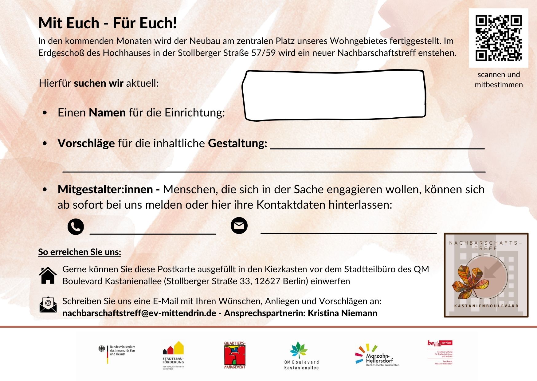 Die Fertigstellung der Gebäude verzögert sich zwar, aber die Vorbereitungen laufen auf vollen Touren. „Wir haben gerade einen Fragebogen erstellt, in dem wir von den Bewohner*innen wissen möchten, was sie sich für den Nachbarschaftstreff wünschen und welche Veranstaltungen und Angebote sie gern dort wahrnehmen möchten“, erzählt sie. „Wir sind auch auf der Suche nach einem passenden Namen für unsere Einrichtung und hoffen auf viele Vorschläge aus der Nachbarschaft. Dafür wurde eine Postkarte entworfen, die demnächst verteilt wird. Darüber hinaus freuen wir uns sehr über Leute, die vielleicht selber einen Workshop oder Kurs durchführen möchten oder uns ehrenamtlich helfen wollen.“