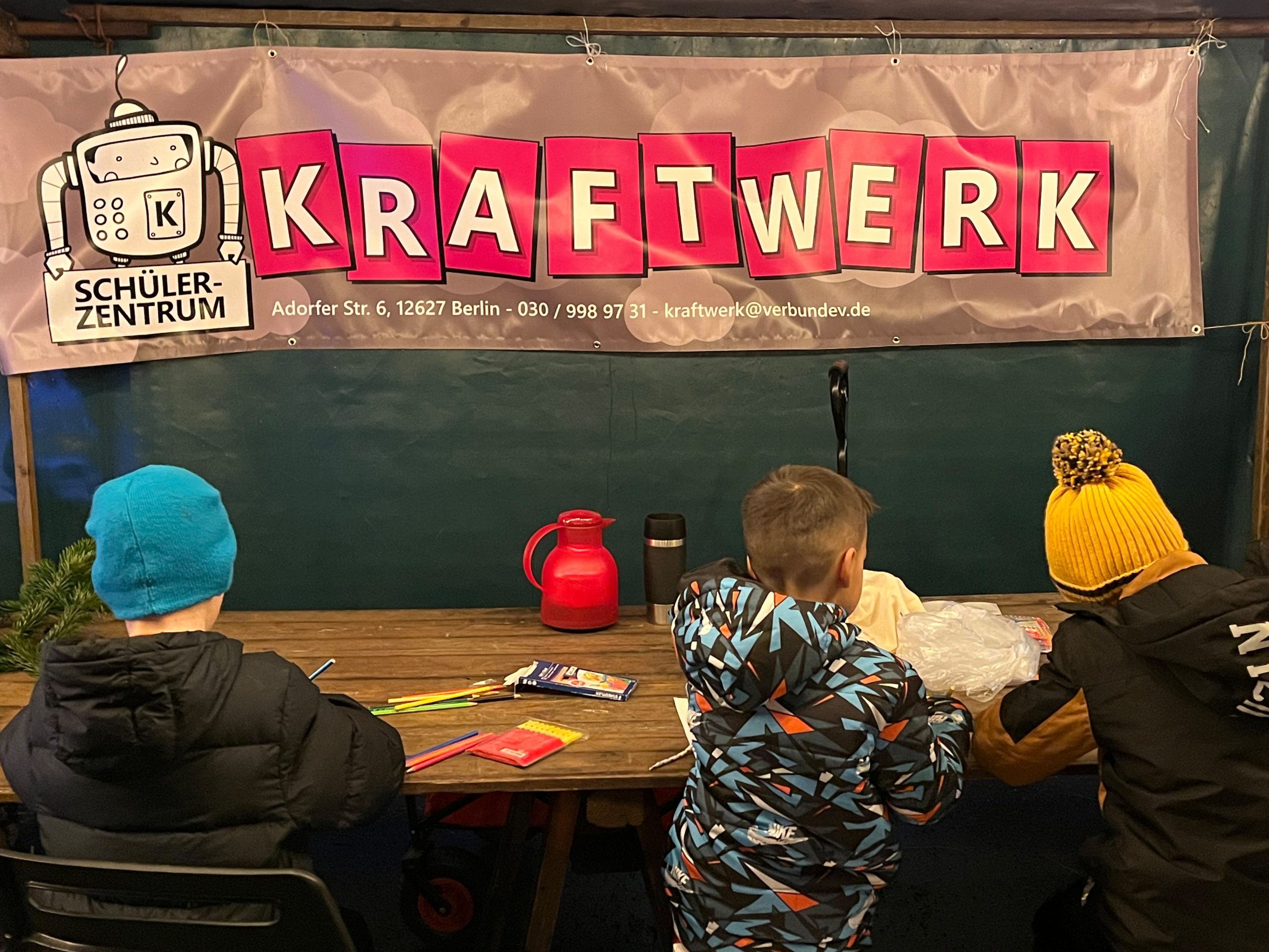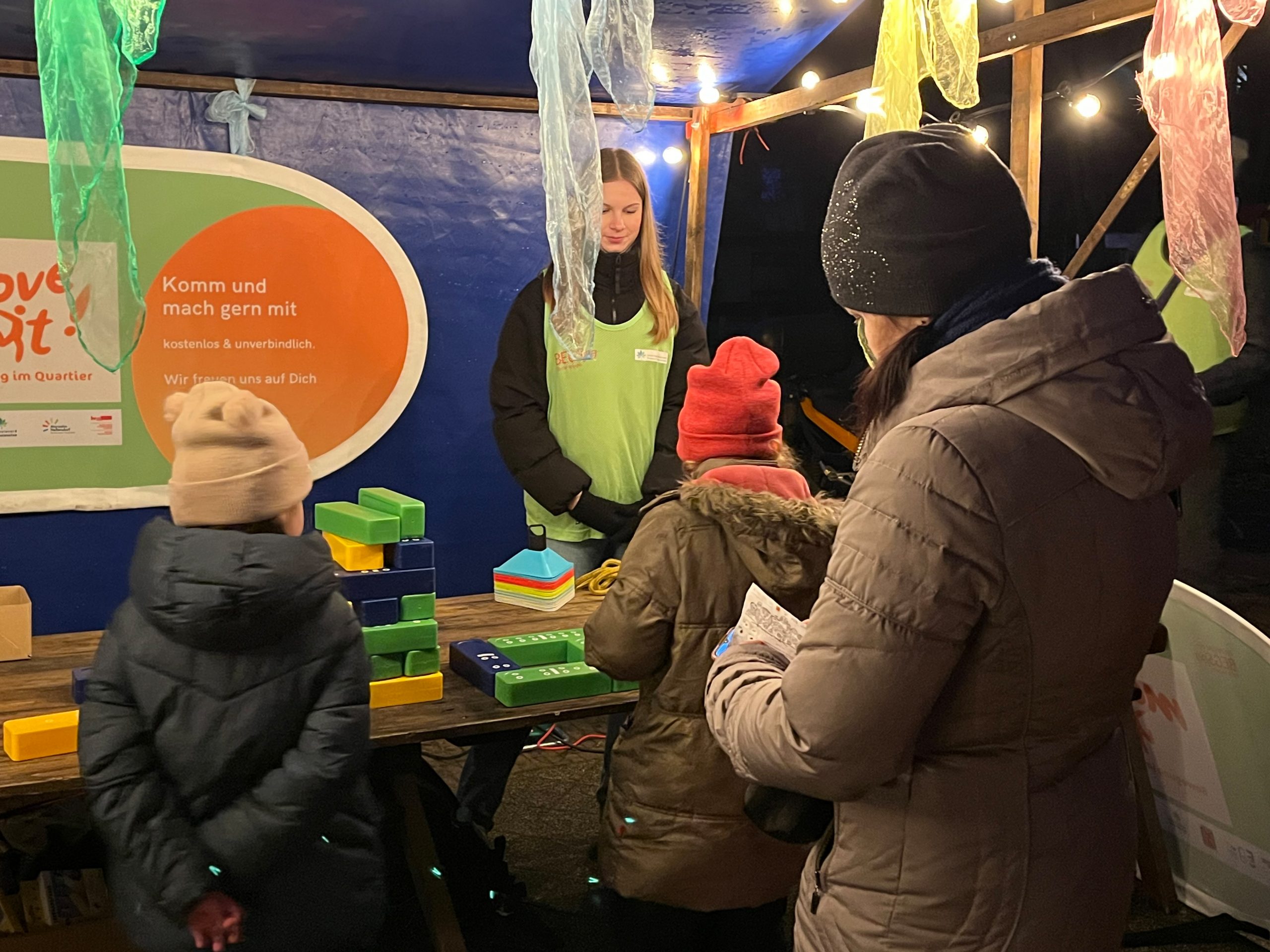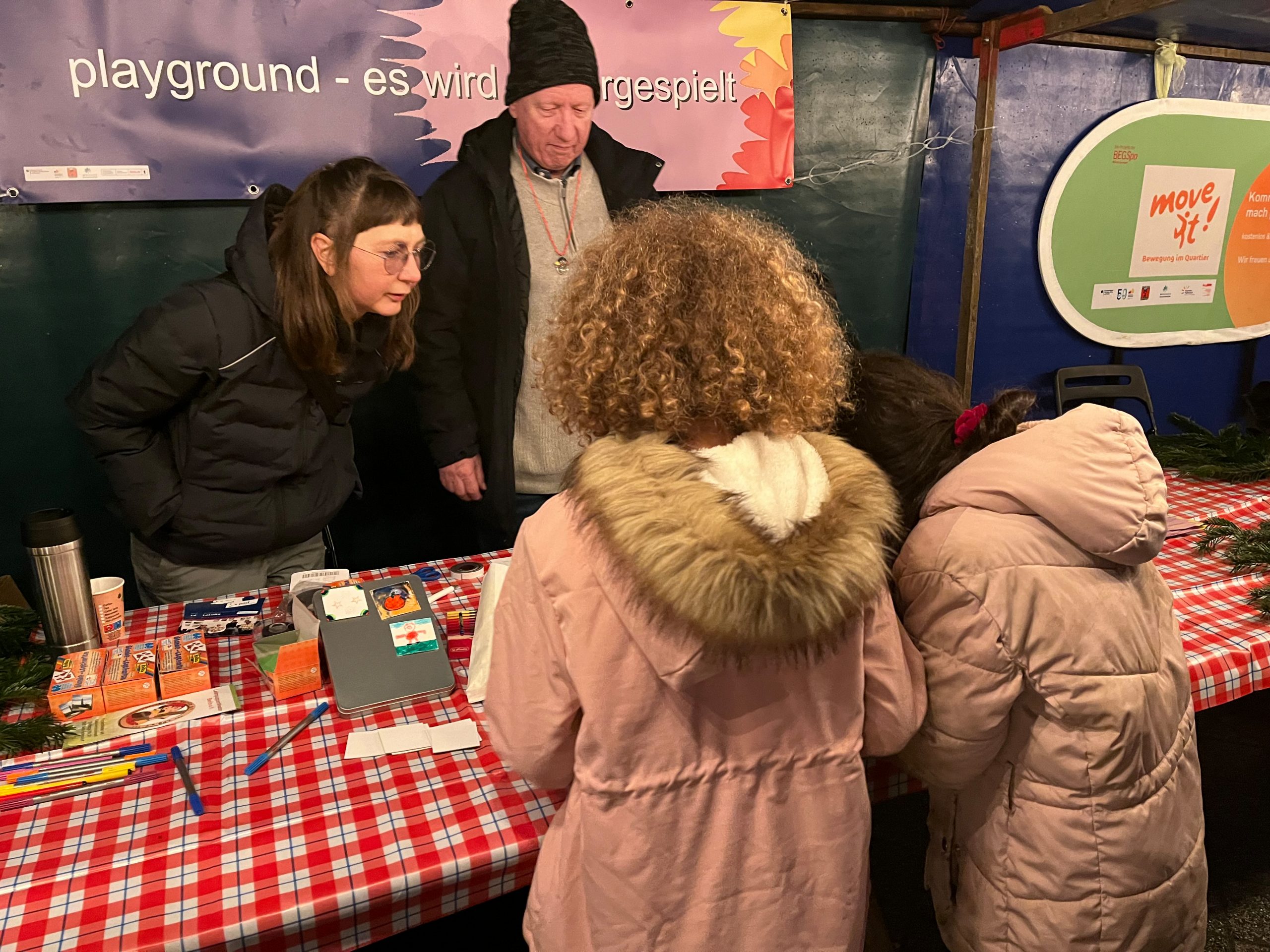 Wer wollte, konnte weihnachtliche Deko und kleine Geschenke kaufen. Beim Weihnachtskarten malen und basteln im liebevoll geschmückten Puppentheater, beim Kerzen ziehen und beim Magnete selbst kreieren machten die Kinder mit Begeisterung mit. Die BEGSpo bot im Rahmen ihres Projektes „Move it! 2.0“ Geschicklichkeitsspiele und verschiedene sportliche Aktivitäten an. Im Puppentheater gab es auch eine kleine Ausstellung mit Arbeiten von den im Kiez wohnenden Street Art-Künstlern Kosah & June, die auch an der Umgestaltung des Gemeinschaftspavillons “Zur Spinne” beteiligt waren (siehe die Fassadengestaltung). Und natürlich war auch der Weihnachtsmann unterwegs, verteilte kleine süße Gaben und nahm noch letzte Wunschzettel entgegen. Am Stand des Quartiersmanagements gab’s kleine Geschenktüten und es wurden Ideen, Wünsche und Anregungen für das Quartier entgegengenommen.